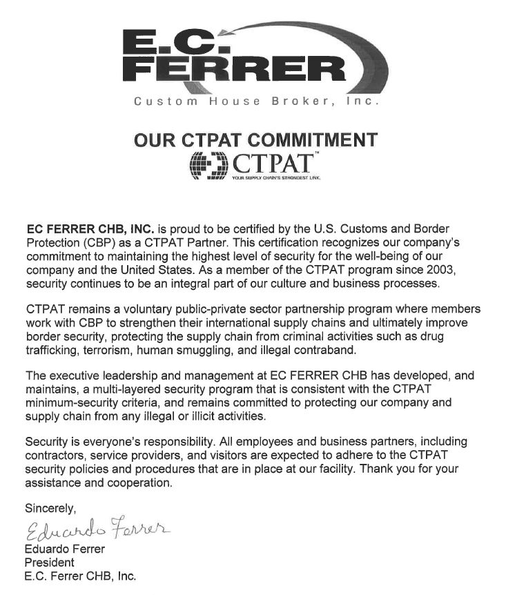 E.C.Ferrer CHB, Inc as a CTPAT Partner